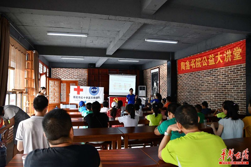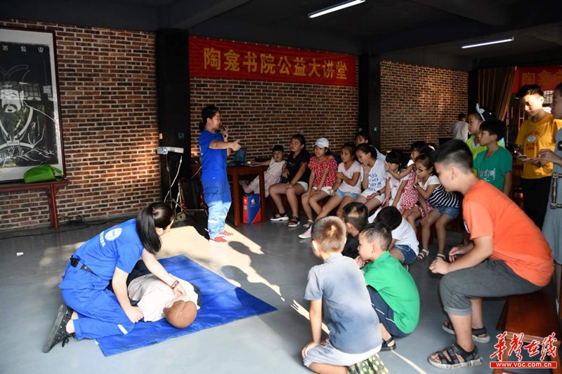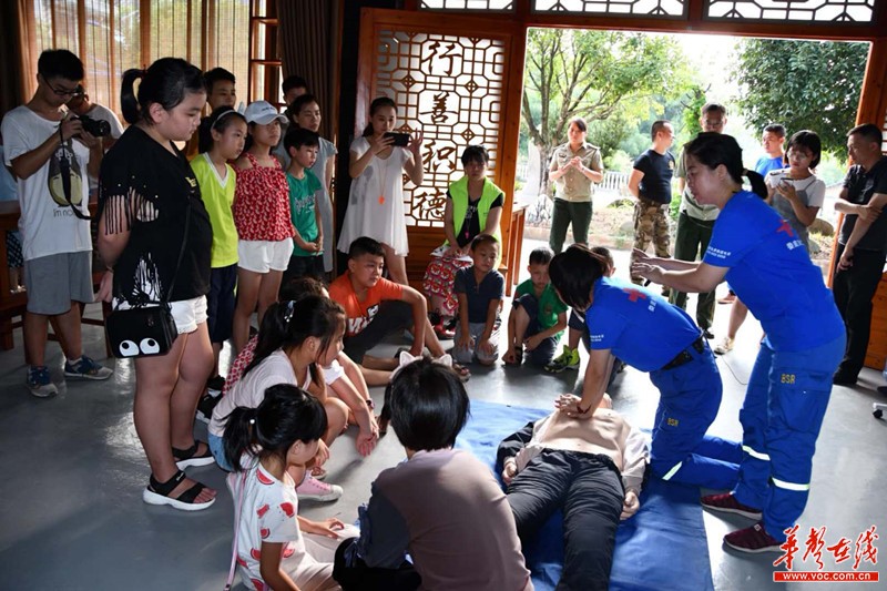 华声在线8月25日讯(通讯员 彭润英 摄影 石苏兰) 8月23日,娄星消防、娄底市红十字蓝天救援队、娄底市厚天消防义工队等应中国应急管理报内参部黄主任邀请,到娄星区万宝镇清江村湘中民俗生态园陶龛书院公益大讲堂给假期50余名小学生、家长、老师宣讲日常应急救护知识和消防安全知识。
