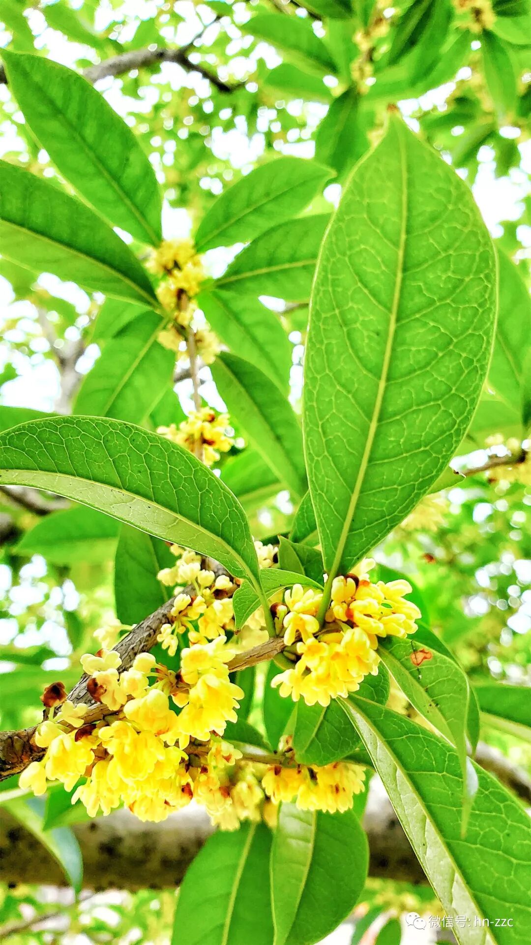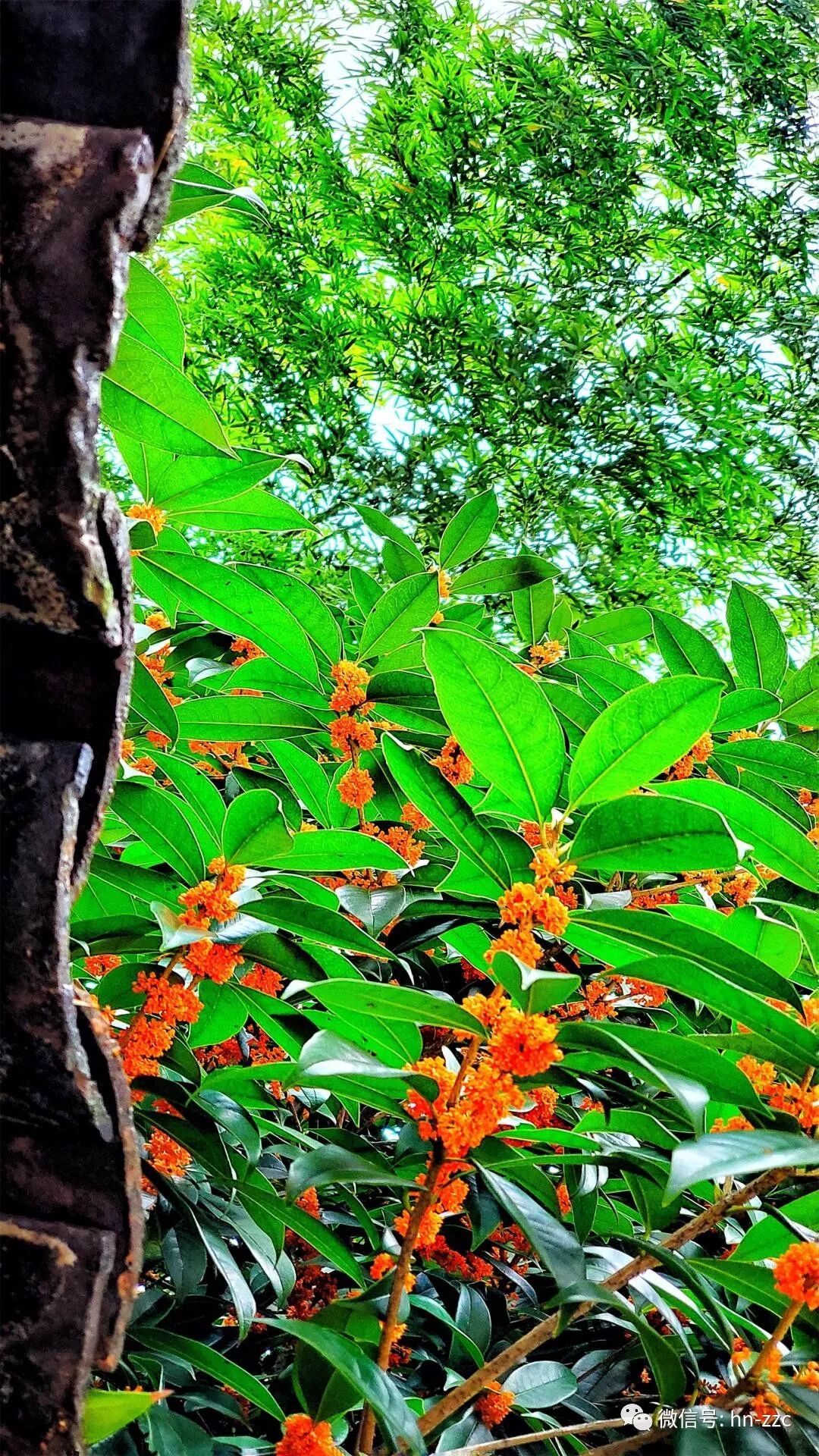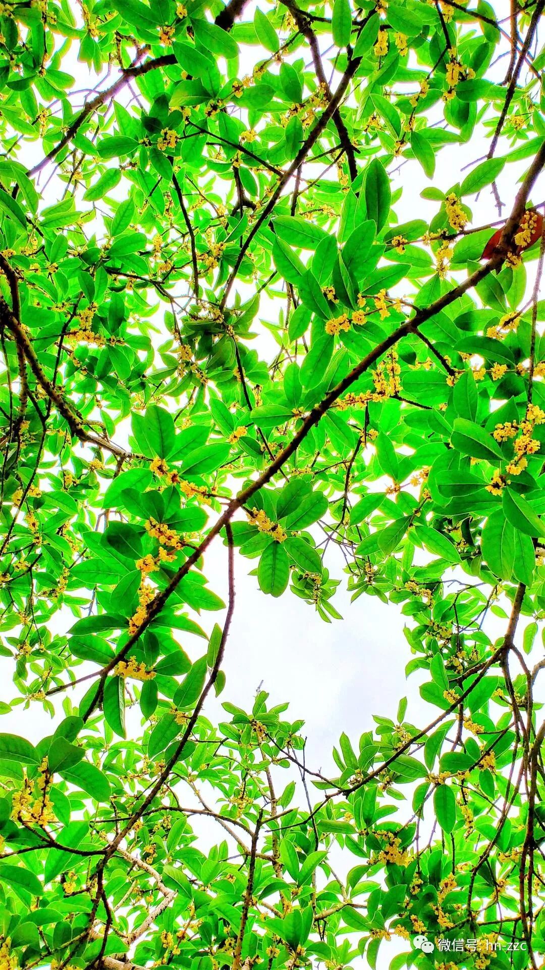 我没有见过丹桂,也很少见花开得如此漂亮的桂花树,自然喜不自禁,拿着手机不停的围着两棵树打转转,透过镜头拉近了看,钻进花枝仰天看,俯仰弓斜变换角度拍摄。
