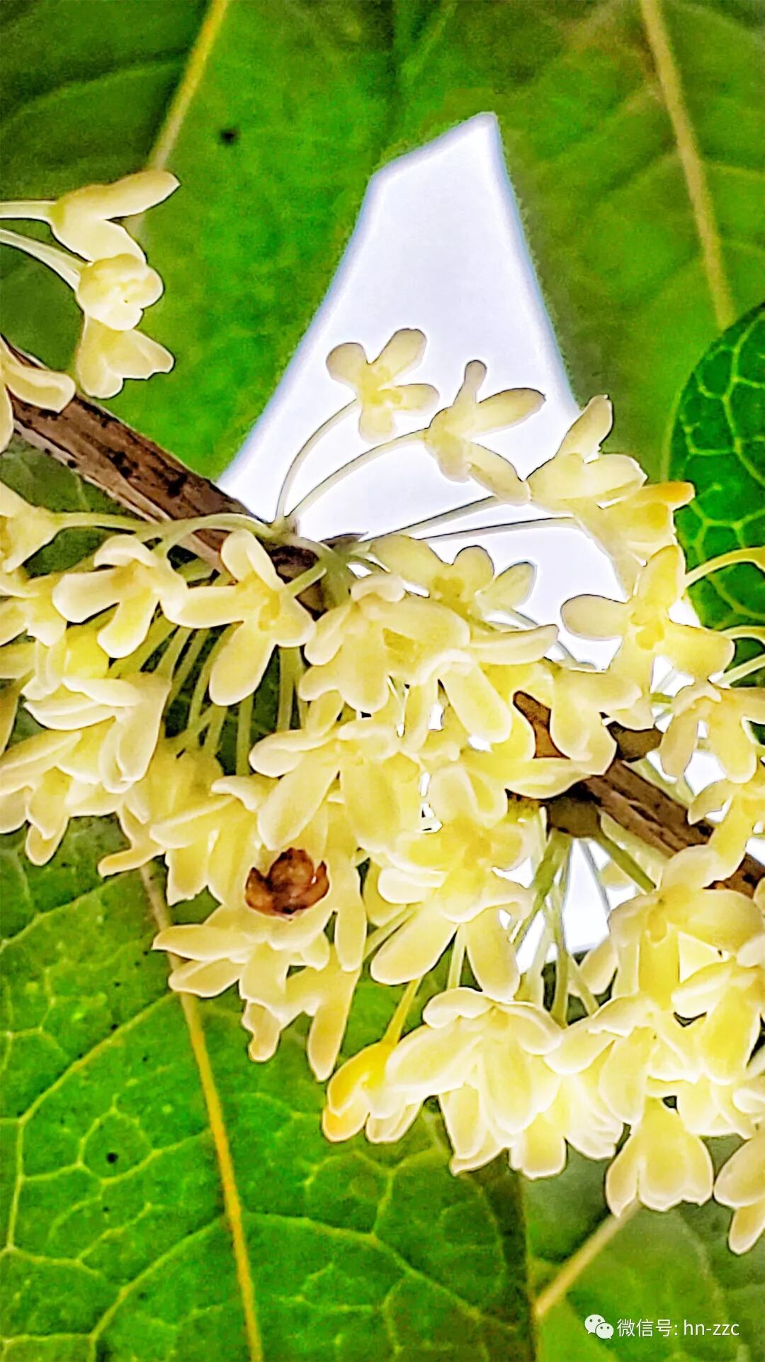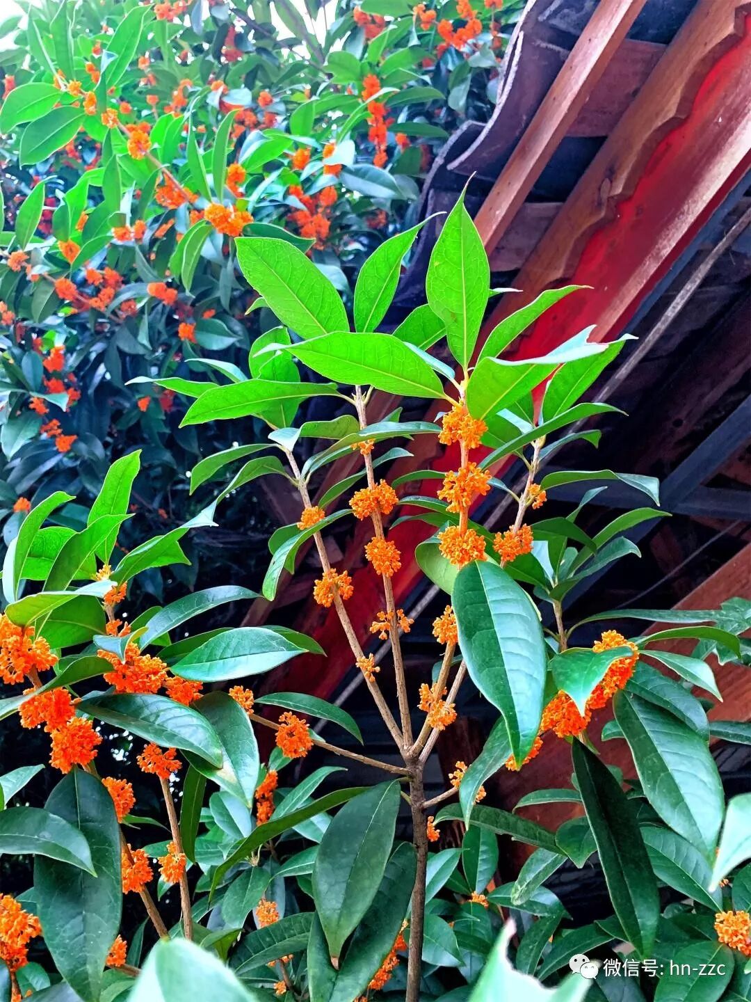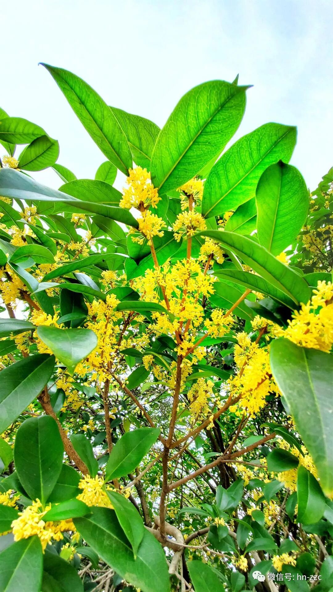 我没有见过丹桂,也很少见花开得如此漂亮的桂花树,自然喜不自禁,拿着手机不停的围着两棵树打转转,透过镜头拉近了看,钻进花枝仰天看,俯仰弓斜变换角度拍摄。